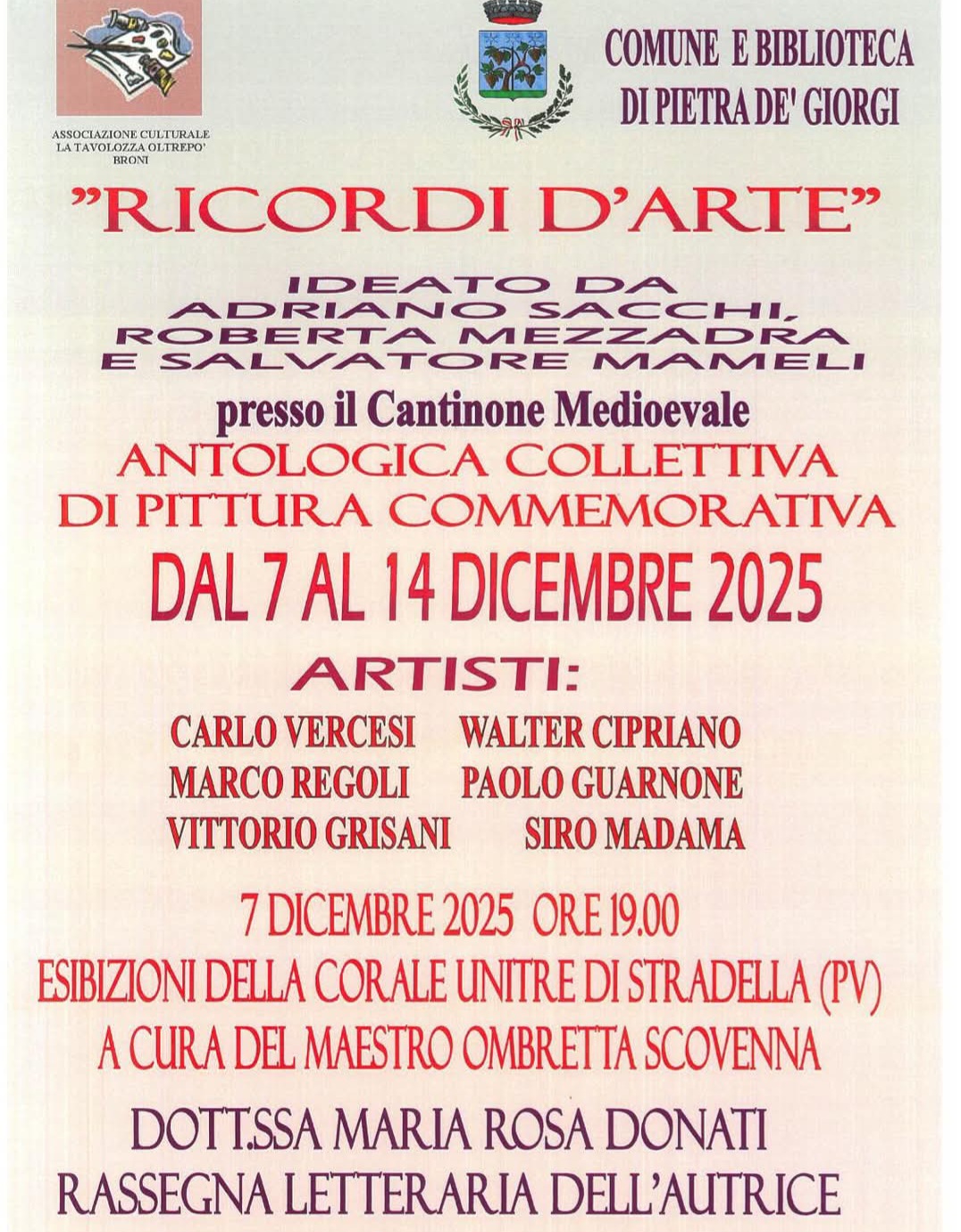 Nel cuore antico di Pietra de’ Giorgi, tra le volte in mattoni del suggestivo Cantinone Medioevale, si è svolta dal 7 al 14 dicembre 2025 l’antologica collettiva di pittura commemorativa “Ricordi d’Arte”, ideata da Adriano Sacchi, Roberta Mezzadra e Salvatore Mameli. Un’iniziativa...